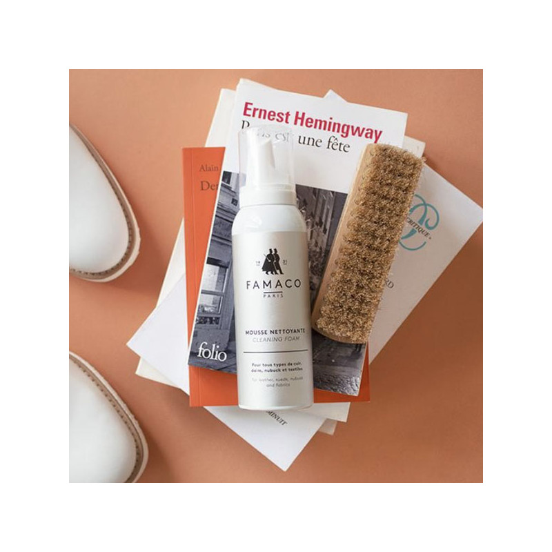 Dépoussiérer la chaussure avec une brosse. Appliquer la mousse nettoyante sur la chaussure puis frotter la surface à nettoyer à l'aide d'une brosse ou d'une éponge.